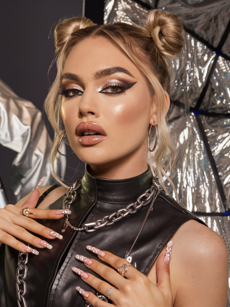 This fall hairstyle 2024 embodies boldness with a slicked-back top and intricate cornrow rasta braids. The high double buns give the look an edgy, futuristic vibe, perfectly balanced by the statement accessories, including bold silver rings and chains. The nails complement the look with an artistic touch of pink and white swirl designs. This trendy look is perfect for women wanting a mix of new and easy styles for long hair.