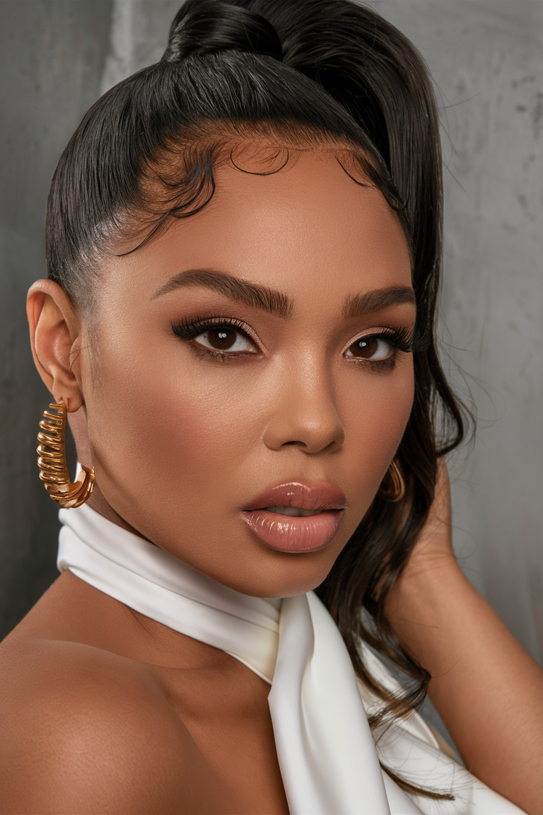 For a more trendy and easy approach to fall hairstyles 2024, this look showcases sleek, free-flowing hair pulled back into a high ponytail. The soft baby hairs along the forehead add an element of softness, making this style ideal for Asian women short or medium-length hair. Paired with gold accessories, this look radiates elegance, perfect for winter or any chic occasion.