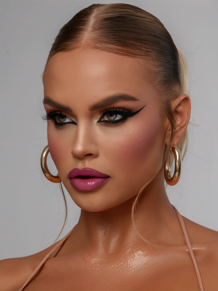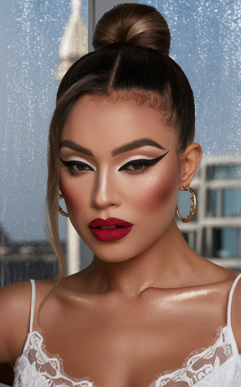 This bold, current hairstyle showcases a slick high bun with sharply defined winged eyeliner and a bright red lip. Perfect for fall hairstyles 2024, the look is highly glamorous, ideal for women trending toward dramatic styles. The soft, glowing skin adds balance to the sharpness of the eyes and hair, making it a perfect trendy option for those wanting an easy, high-impact look for events or photoshoots.
