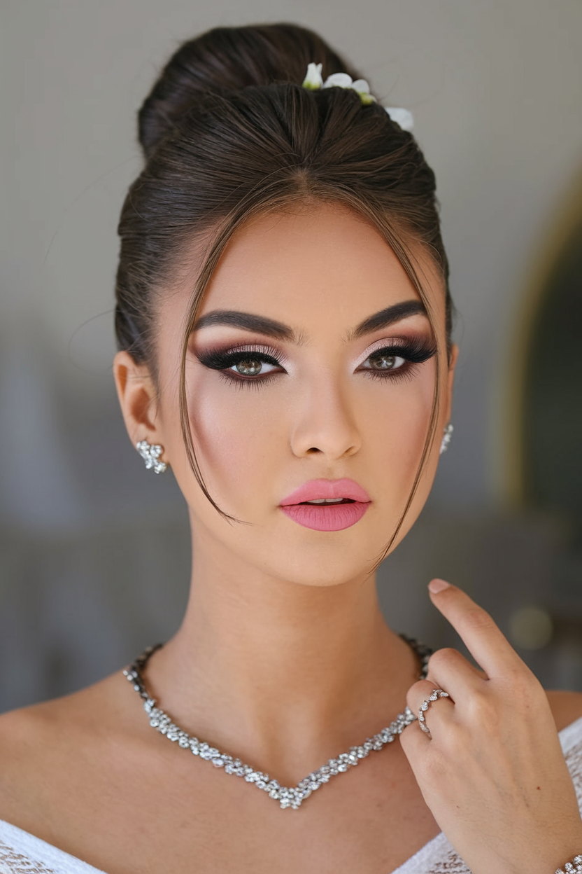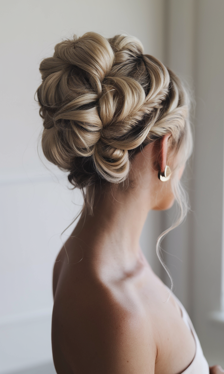 This high, structured bun is a trending look for fall hairstyles 2024, perfect for formal events and women looking for a clean, polished look. The addition of floral accessories adds a touch of softness to the sleek design. Perfect for long hair, this updo combines elegance with timeless appeal, making it a standout choice for special occasions.