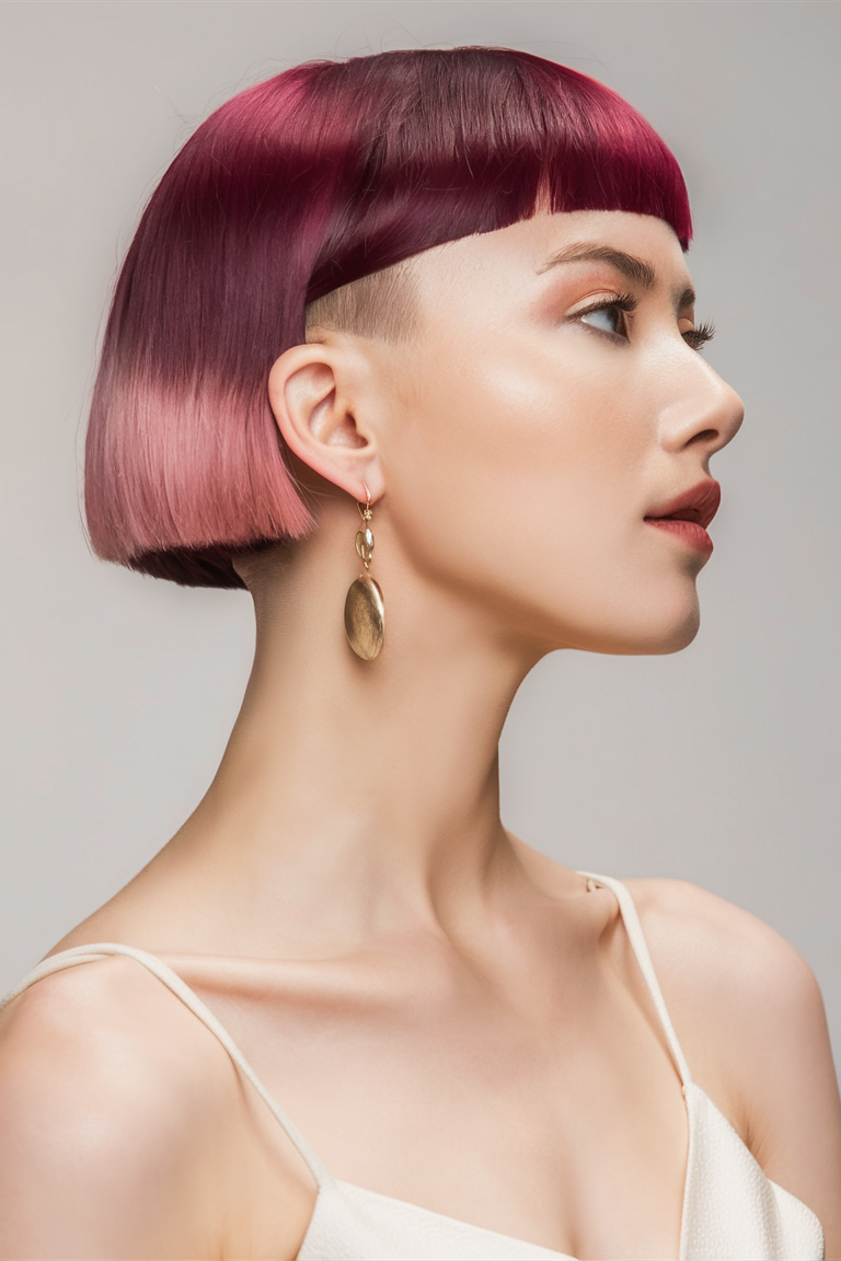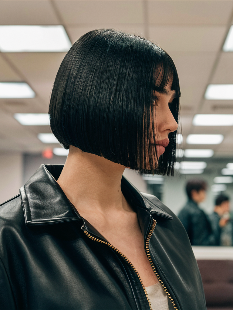 A striking inverted bob, this cut is sleek, straight, and ultra-modern, with a blunt fringe to complete the look. The smooth black texture emphasizes the sharpness of the cut, while the fine hair makes it easy to maintain. This style is a contemporary take on the 90s bob, making it a go-to for women seeking bold and new trends for fall bob haircuts 2024.