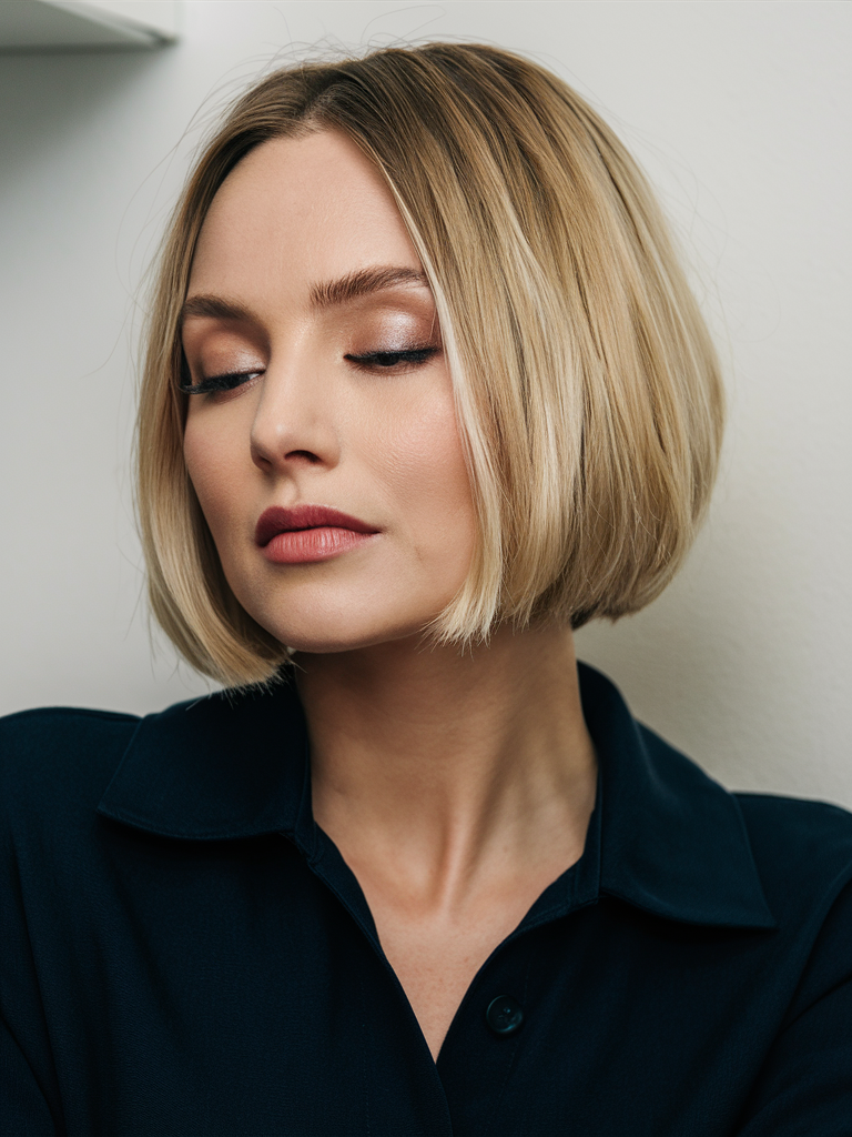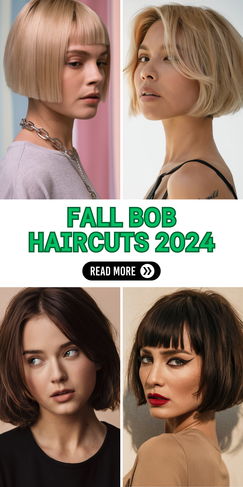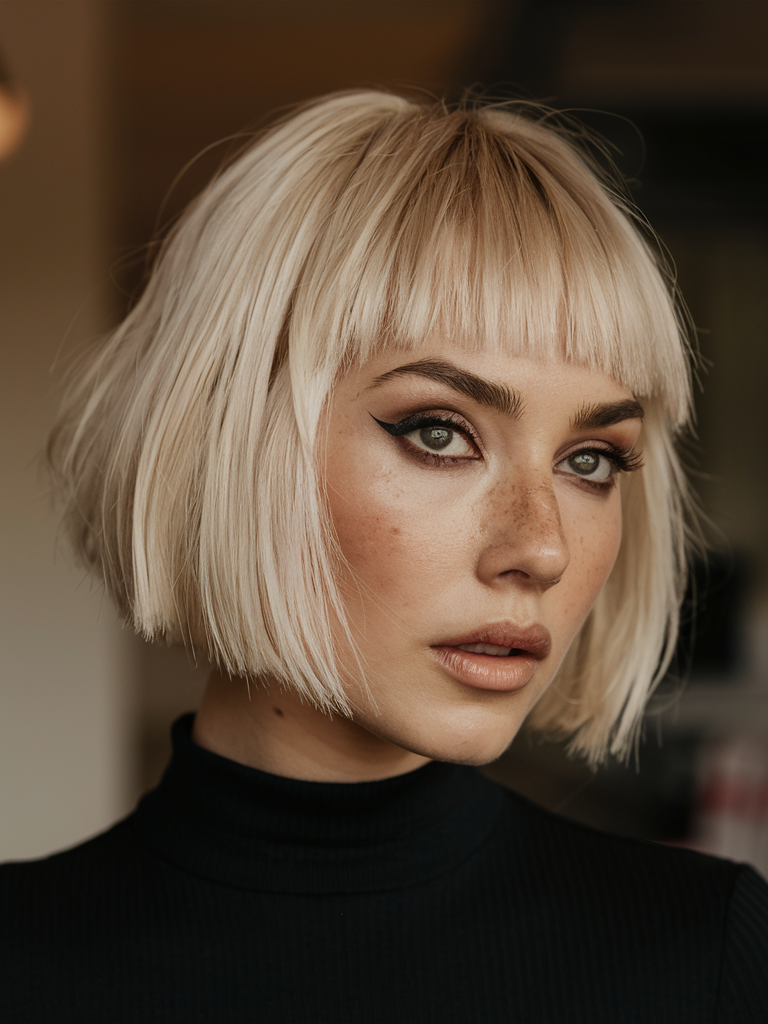 A bold, straight micro bob with blunt bangs, this platinum blonde cut brings a modern twist to a classic style. The box-like structure and sharp lines highlight the face, giving it a sleek, minimalist vibe that’s perfect for the fall bob haircuts 2024 trends. The short length paired with fine hair creates an edgy, contemporary look ideal for fashion-forward women seeking an effortlessly chic haircut.