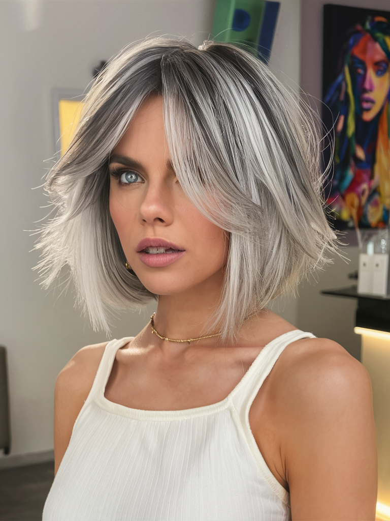 A high-fashion inverted bob with silver streaks, this hairstyle plays with contrast and volume for a truly unique look. The angled layers add a trendy long effect in the front while the shorter back ensures an easy-to-manage style. The cool-toned silver adds a fresh and new take on fall bob haircuts 2024, ideal for women wanting a statement haircut for the season.