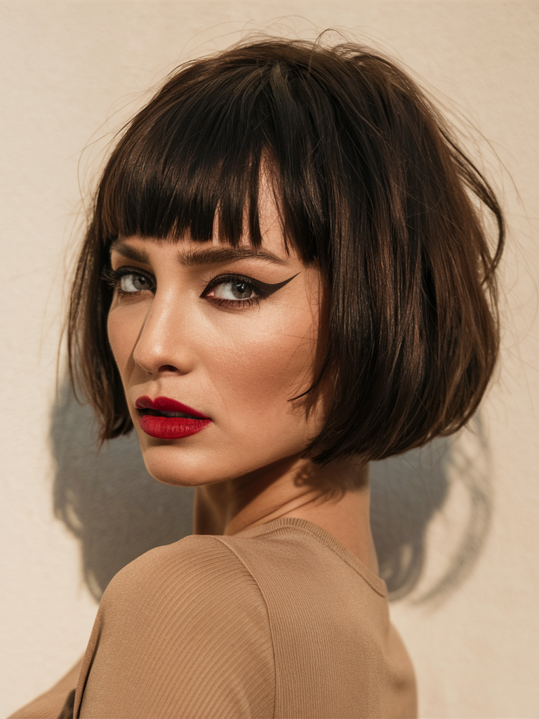 A sharp, edgy brunette bob with blunt bangs, this style is all about precision and boldness. The stacked layers add depth, while the straight cut and bangs bring out a sleek, modern edge. Perfect for women with fine hair looking to embrace a new and bold trend this autumn, this bob exudes confidence and style.