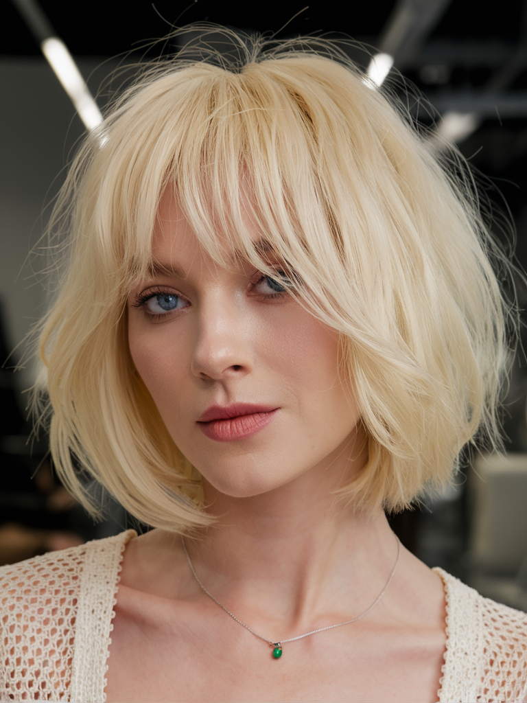 This modern blonde bob features tousled layers that add a carefree and playful texture. Perfect for fall bob haircuts 2024, the choppy ends bring volume and movement, ideal for fine hair. The soft, wavy finish makes this cut versatile, great for casual or dressed-up looks. It aligns perfectly with the autumn trends, giving a relaxed yet chic vibe for women looking for a fresh style.