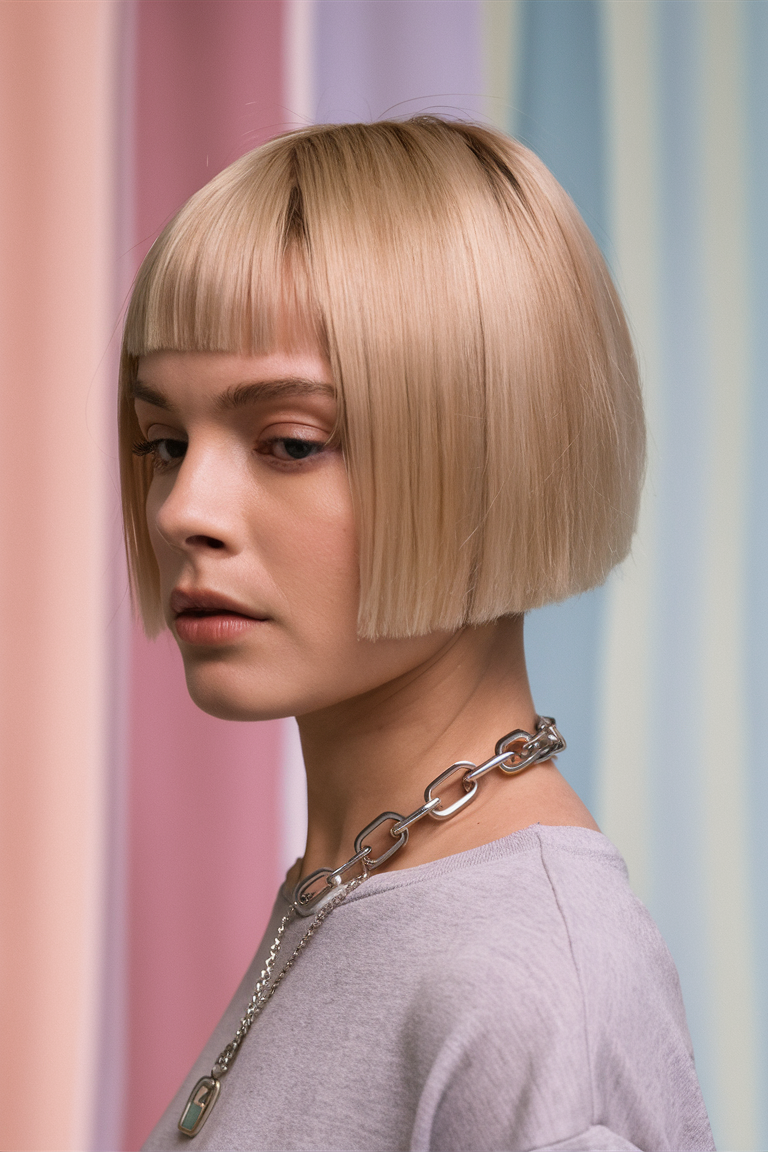 This sleek, platinum micro bob with sharp edges and blunt bangs exudes high fashion. The straight and box-like structure fits perfectly into the new trends for autumn, giving off a minimalistic yet bold look. The sharp precision of this stacked bob is ideal for women with fine hair wanting a striking, structured haircut.