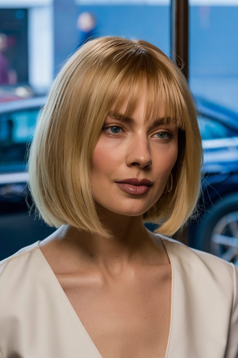 This textured bob with a soft fringe captures a relaxed, bohemian vibe. The light blonde color and wavy layers bring effortless volume, making this a trendy option for fall bob haircuts 2024. The soft bangs add a playful touch, making this style perfect for women who want a fresh, airy look for the season.