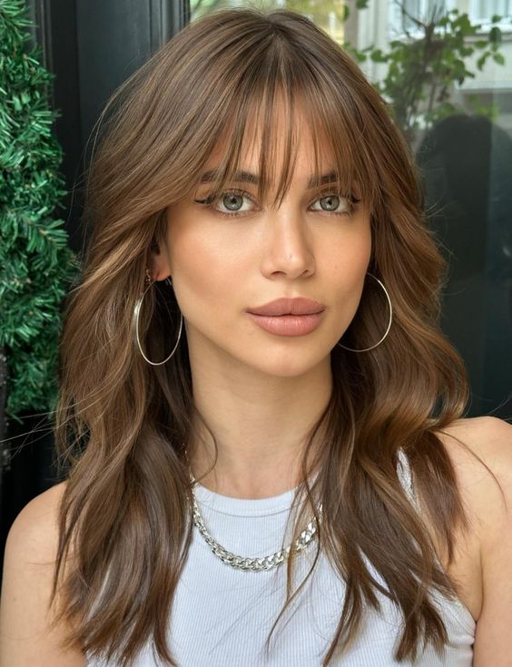Soft bangs paired with textured waves provide a cute, simple, and trendy look for those seeking 2024 medium hairstyle inspiration. This style is a nod to the beloved shag cut but with a softer, more refined approach, making it suitable for a wide range of occasions and easy to dress up or down.
