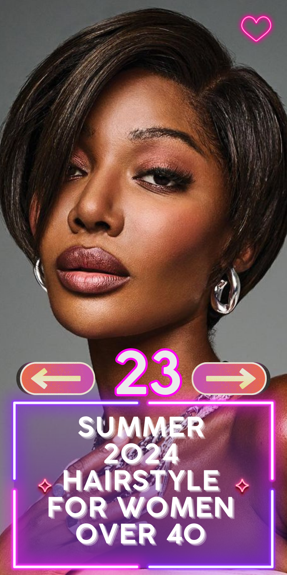 A short hairstyle that’s as fun as it is chic. The platinum blonde hue adds a trendy flair, perfectly complementing the summer sun. It’s a simple and sleek look that’s easy to manage, making it a practical choice for women over 40. The side-swept bangs add a touch of playfulness, while the overall style remains elegant and easy for everyday wear.