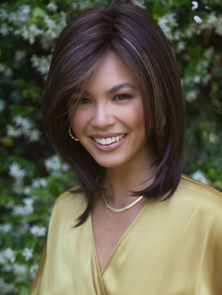 Here’s a medium hair shoulder length cut that’s all about movement and texture. The layers are cut in a way that they flounce with each step, giving a youthful and energetic vibe. This medium length style with its subtle highlights is versatile for both straight hair and wavy hair, and the rich brunette tone is a classic choice for brunettes of any age.