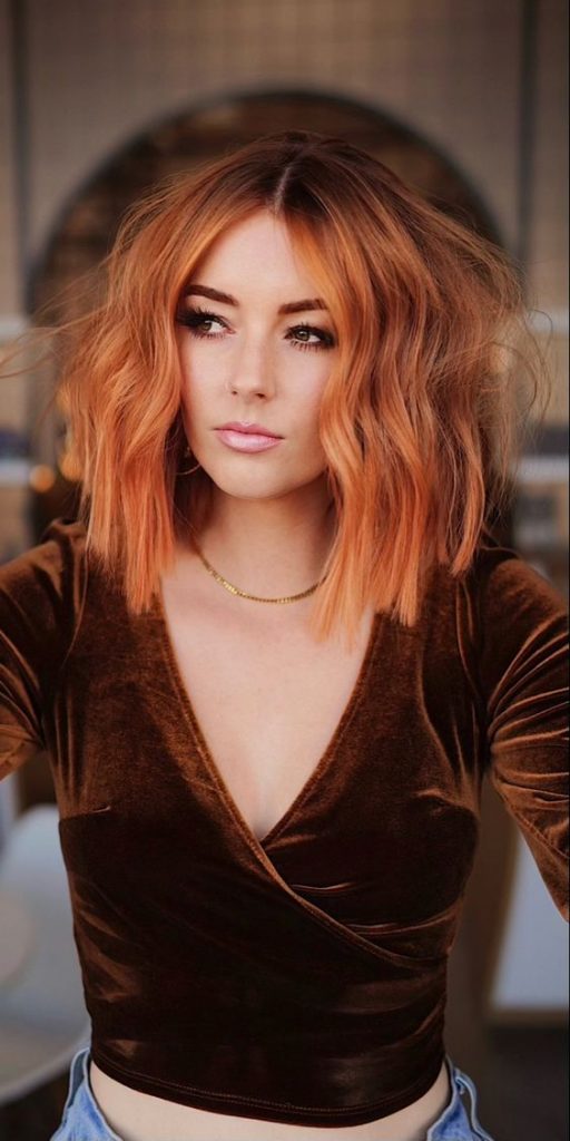 The first photo captures a short bob haircut in a mesmerizing cooper hue that mirrors the softness of a fading sunset. Ideal for those with a fair to medium skin tone, this look may not be the best for those with very dark undertones. The color plays with light, giving off an iridescent colour that’s both warm and inviting. For achieving this at home, I’d recommend the L’Oreal Paris Feria in Sunset Copper. It’s a color that works best on light to medium brown hair, giving depth and warmth simultaneously.