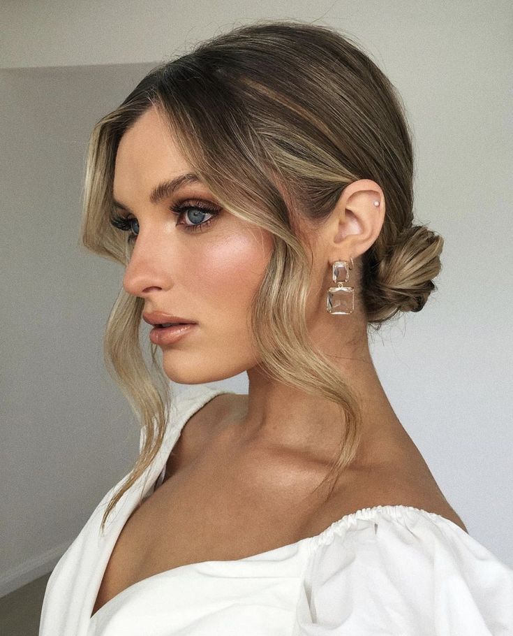 The first look is an embodiment of simplicity and grace, ideal for a breezy evening by the sea. It features a simple low bun that’s both practical and cute. The bun sits neatly at the nape, while a few loose strands are allowed to flirt around the face, adding softness to the look. The style is accessorized with clear geometric earrings, making it perfect for those with medium hair. To achieve this, gather your hair into a low ponytail, twist it into a bun, and secure with pins. Add a touch of hairspray for hold, and you’re ready for a sunset dinner on the beach.