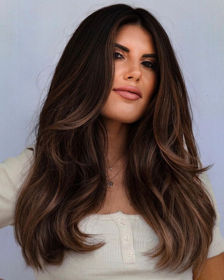 The second image presents a mesmerizing shade of chestnut brown, delicately enhanced with subtle blonde highlights. This color choice is on-trend, marrying the natural depth of dark brown hair with light-reflecting strands that add dimension and movement. It’s a versatile look that can easily transition from a casual daytime to an elegant evening affair, making it a go-to for 2024.