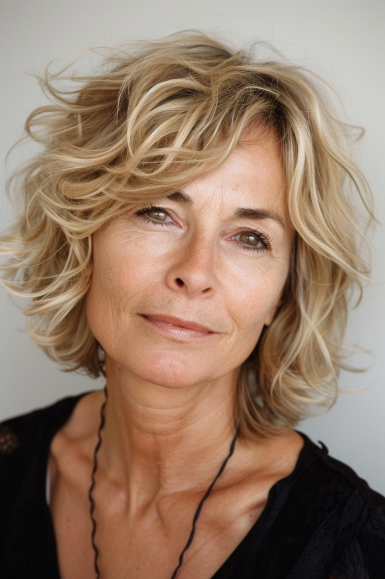 This hairstyle is a beautifully tousled wavy bob with layers that give it that perfectly imperfect, lived-in vibe. The soft, golden blonde highlights are blended seamlessly throughout, adding warmth and dimension to the cut. The piecey layers around the face gently frame it, creating a flattering and youthful effect. The loose waves give it a relaxed and playful energy while still looking polished enough for any occasion.