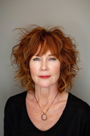 This shaggy bob is all about boldness and texture. The rich, coppery red hue brings warmth and vibrancy to the style, making it perfect for someone who loves to stand out. Feathered layers throughout the cut add movement and body, while the soft bangs frame the face beautifully, drawing attention to the eyes. The tousled finish gives it a carefree and youthful vibe, yet it feels polished and intentional.