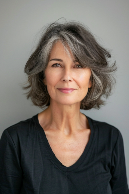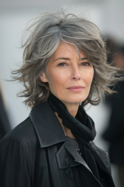 This shaggy bob captures the perfect balance of elegance and edge, with naturally blended silver and charcoal tones that give it a windswept, effortless look. The textured layers create stunning movement, while the soft bangs sweep to the side, drawing attention to the eyes. The slightly tousled style adds volume and drama, making this a bold yet wearable choice.
