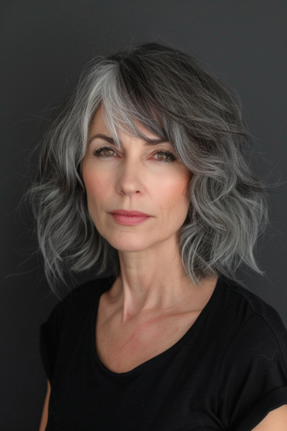 This cut features expertly layered waves that create a soft, flattering shape with just the right amount of volume. The silvery strands blend beautifully with darker tones, giving a natural ombré effect that feels sophisticated and fresh. The feathered ends and gently side-swept bangs add a touch of softness, making it perfect for framing the face.