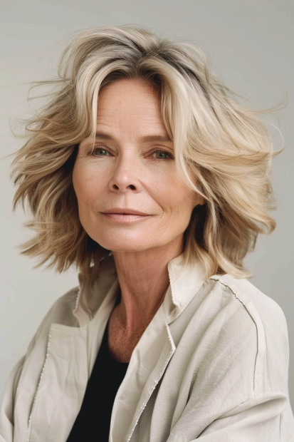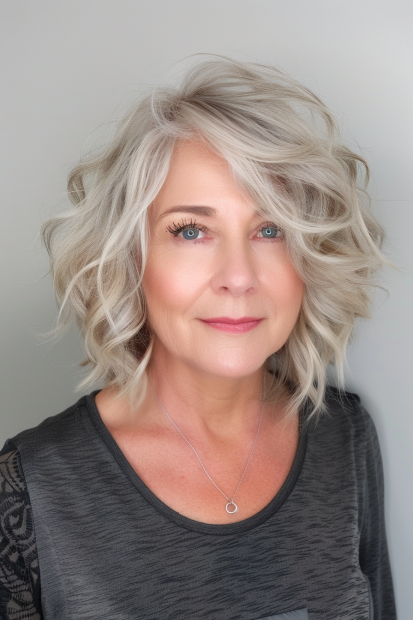 What makes this style so special is how effortlessly glamorous it feels. The platinum tones add a touch of sophistication, while the wavy layers keep it youthful and fun. It’s one of those cuts that instantly makes you feel polished, even on your most casual days. Plus, let’s be honest, who doesn’t love hair that looks this fabulous with minimal effort? It’s a total confidence booster!