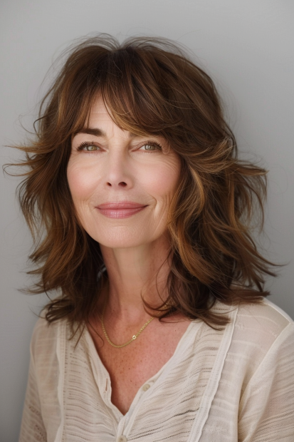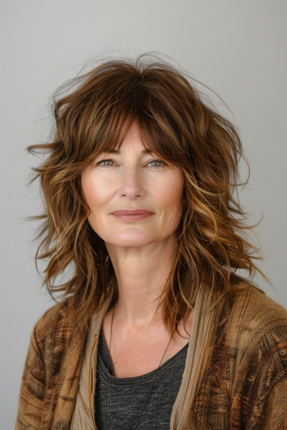 What I adore about this style is how effortlessly cool it is. It’s like the perfect balance between laid-back and stylish—ideal for someone who wants a haircut with personality. The warm tones pair beautifully with the tousled layers, giving off that “I just came back from a weekend retreat” energy. Plus, the volume makes it look full and youthful, which is always a win!