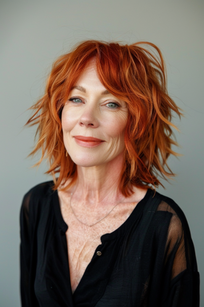 This vibrant shaggy bob is all about making a statement. The rich auburn tones give the hair a fiery glow, while the choppy, textured layers add volume and edge. Face-framing pieces and wispy bangs create a playful and flattering shape, giving the style a dynamic energy. The slightly tousled finish keeps it fresh and modern, perfect for those who love a bold look.