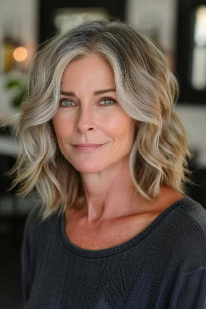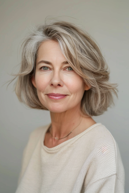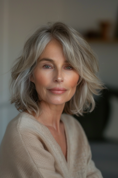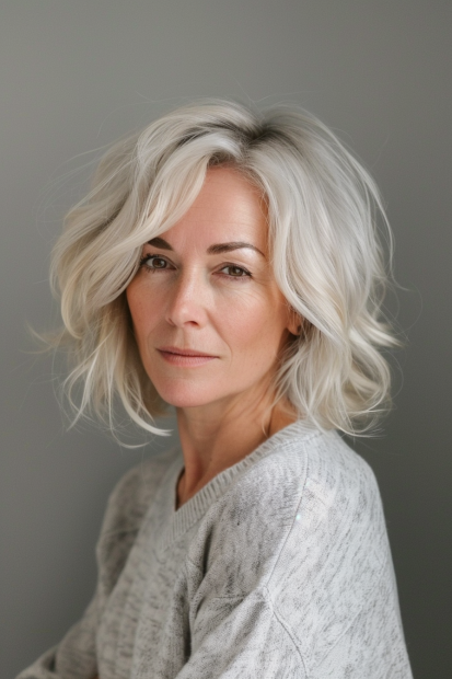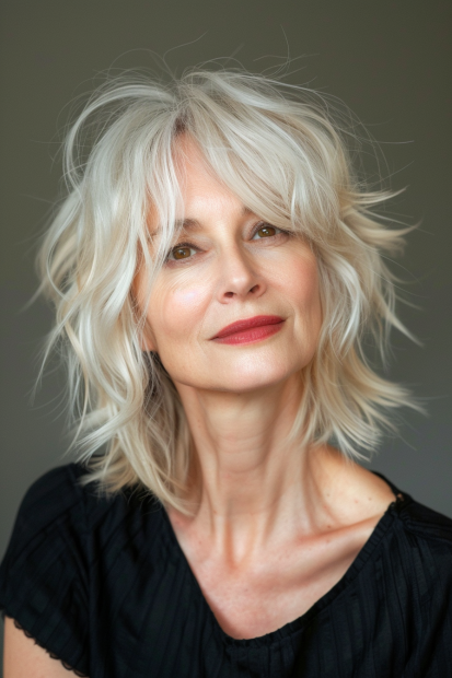 This graceful shaggy bob exudes effortless beauty with its soft layers and natural silver tones. The textured waves add lightness and movement, creating a relaxed yet sophisticated look. The side-parted fringe gently frames the face, enhancing cheekbones and drawing attention to the eyes. The overall style feels breezy and timeless, perfect for showcasing natural beauty.
