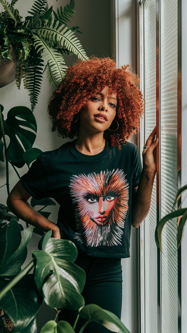 These bold copper curls cascade beautifully, framed by soft bangs. The vibrant tones enhance the texture, making it a go-to style for fall women’s hair ideas. Perfect for women thick hair and round faces women, this playful look adds warmth to any season.