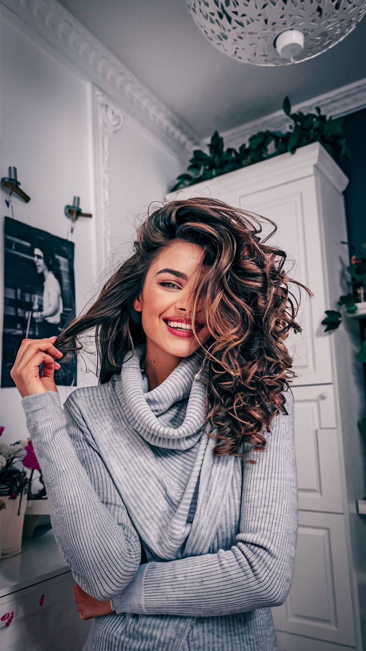 This look combines voluminous curls with soft, sun-kissed highlights for added movement. Perfect for women thick hair, it’s an ideal choice for fall women’s hair ideas or transitioning to spring women’s haircuts.