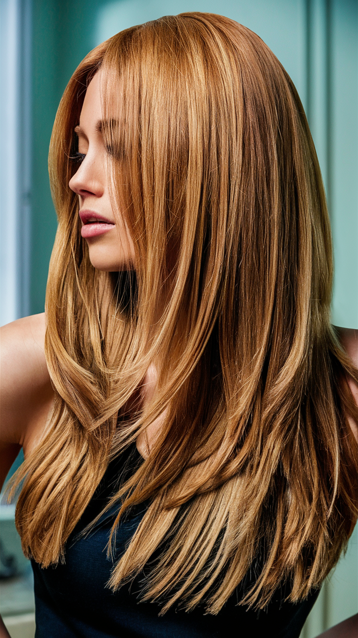 This hairstyle highlights soft, flowing layers with a blend of golden and strawberry Bronde hues. The warm tones add depth and radiance, perfect for fall women’s hair ideas. The smooth finish enhances the overall polished yet natural look.