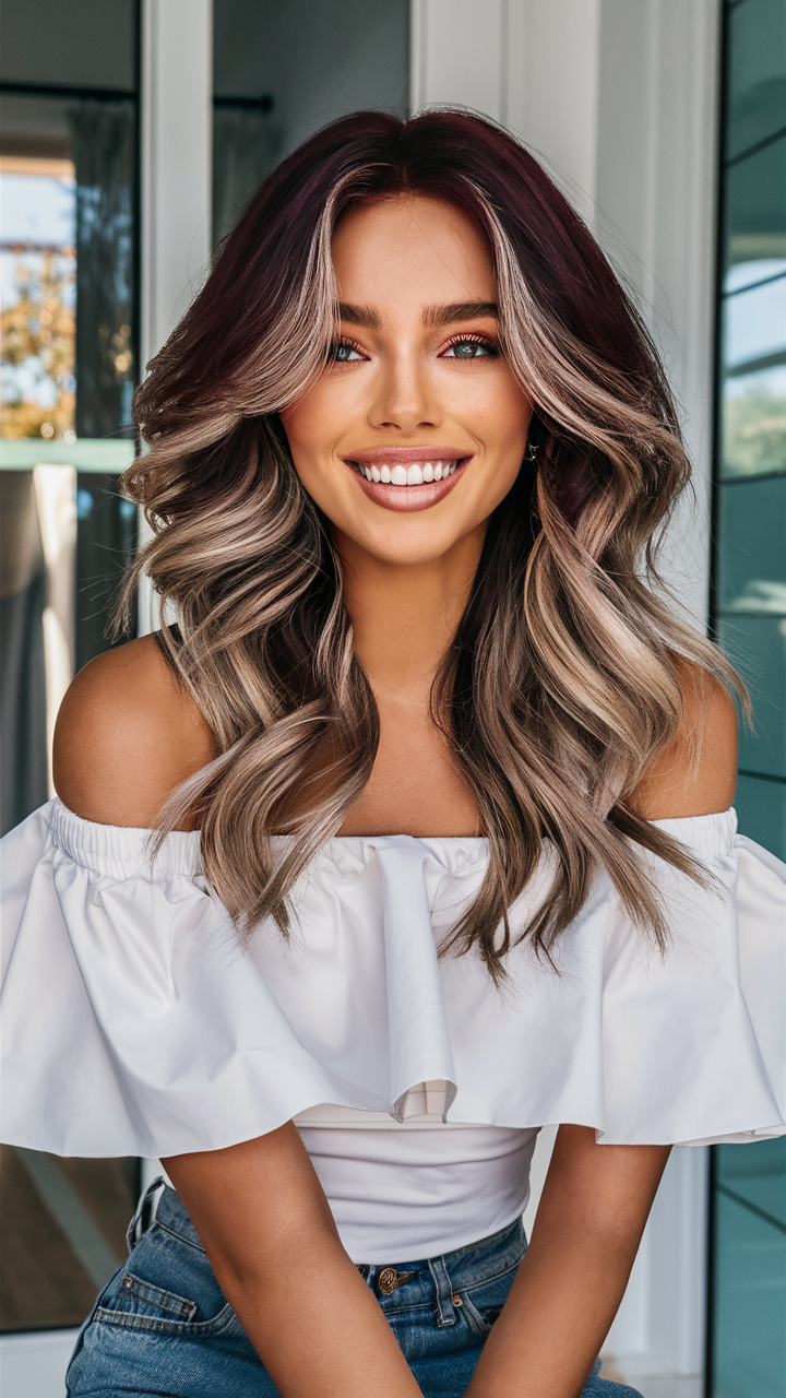 This hairstyle features long, flowing waves in a vibrant Cherry Cola hair color. Soft light brown balayage highlights add dimension, enhancing the natural movement of the curls. Perfect for a spring haircut or summer women’s hairstyle, this look works beautifully for pale skin tones.