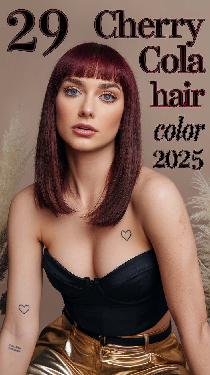 This bold bob haircut is styled with a Cherry Cola hue, creating a striking, vibrant look. The full fringe adds structure, while the ends are slightly flipped for a playful, dimensional touch. Ideal for women’s summer hairstyles, this cut beautifully complements brown skin tones.