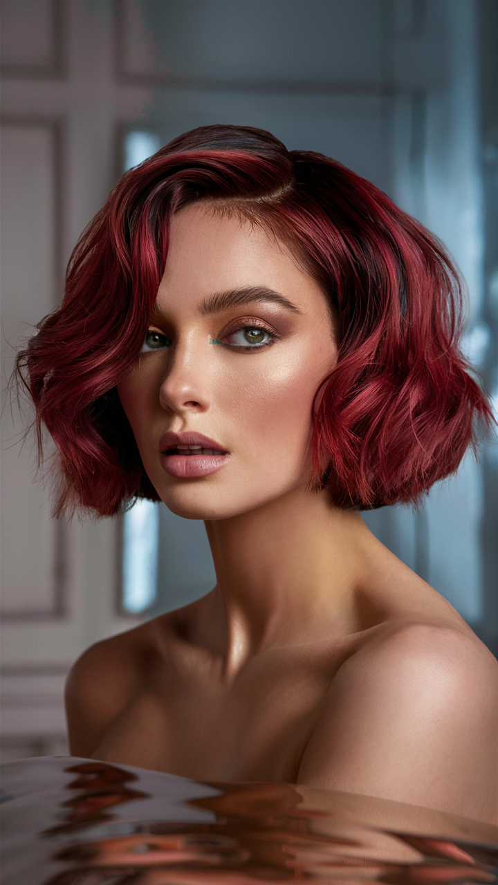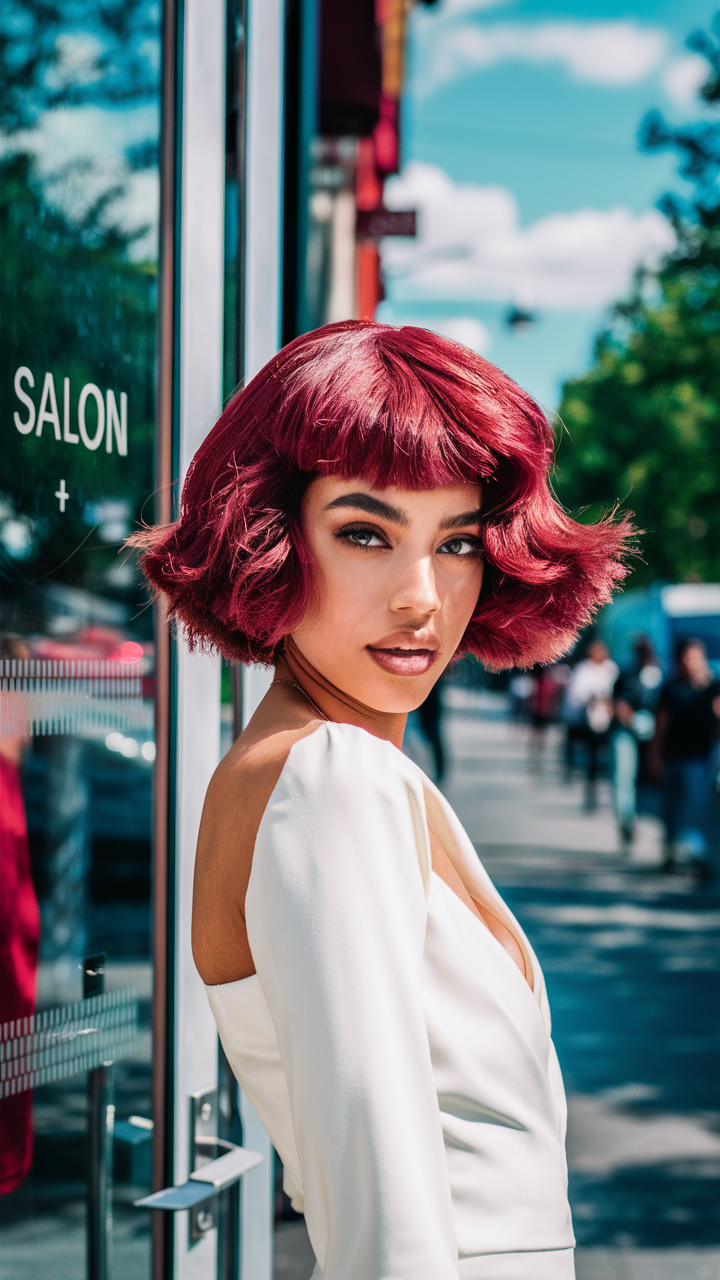 This short bob haircut features rich Cherry Cola hues that bring out its texture and movement. The soft waves give it a playful yet polished look, making it ideal for a spring women’s haircut. The dark red tones create depth and dimension, beautifully suiting light or pale skin tones.