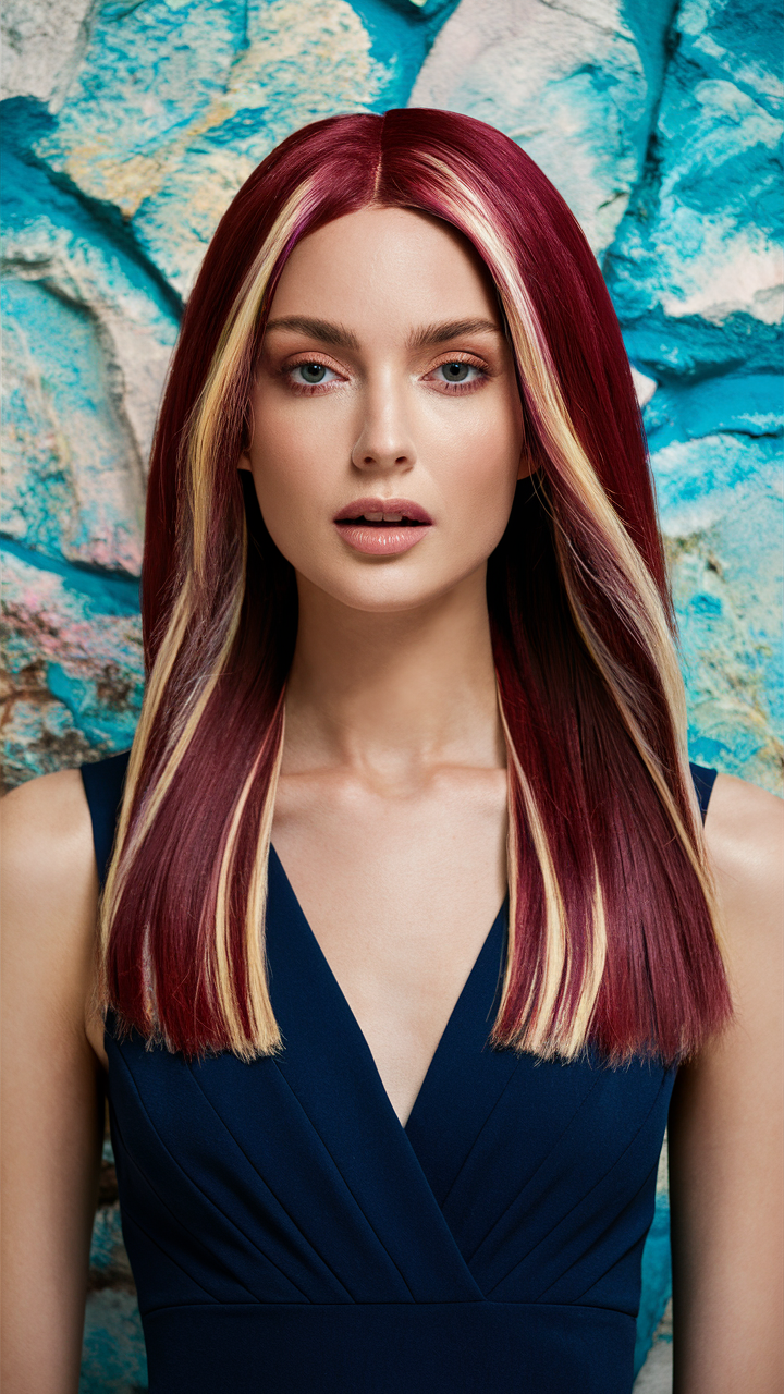 This sleek, straight style features a Cherry Cola base enhanced by bold blonde streaks framing the face. The contrast of dark and light tones provides a striking, modern edge, perfect for a spring women’s haircut. This polished look suits pale or light skin tones, creating a radiant effect.