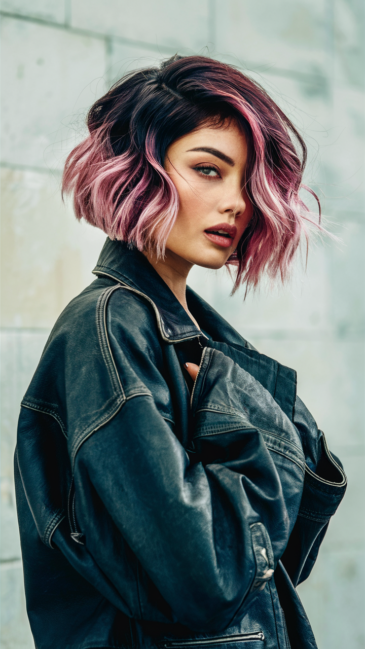 This textured wavy bob blends dark Cherry Cola roots with soft pink balayage for a unique gradient. The loose waves emphasize the dimensional color, making it an ideal fall women’s hair idea. This edgy yet soft style works beautifully for Indian or darker skin tones.