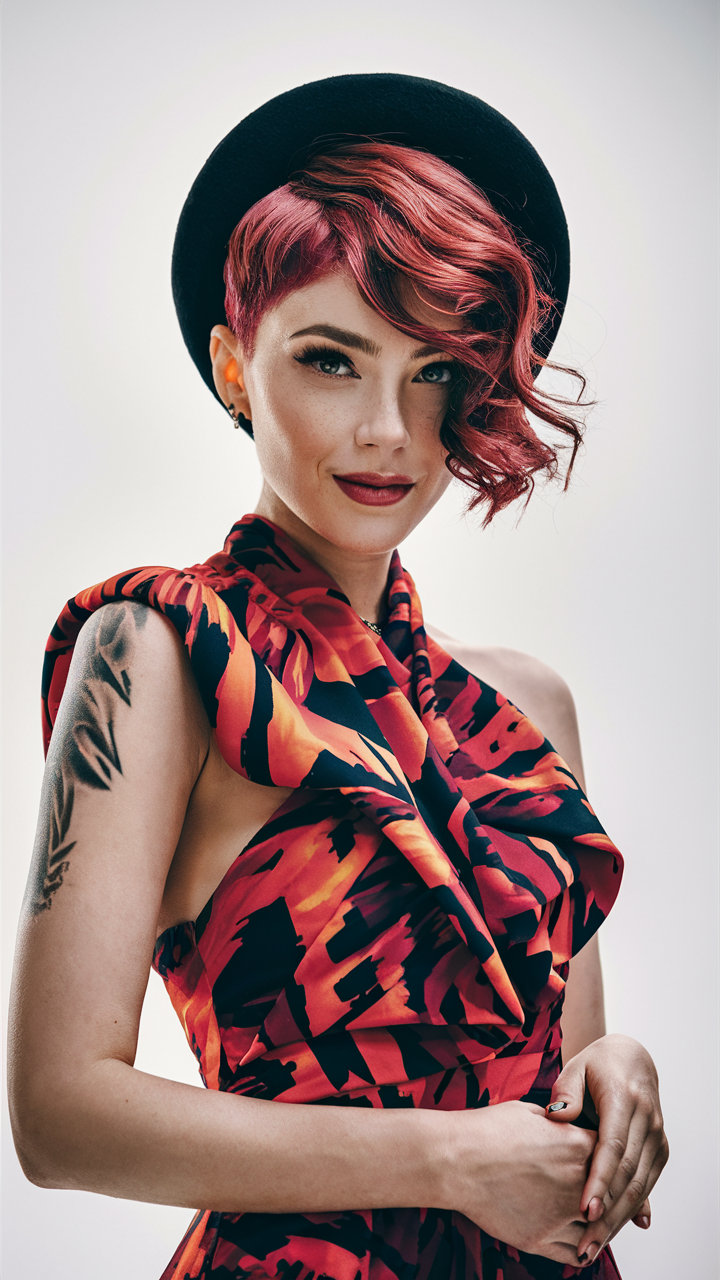 This asymmetrical pixie cut combines bold Cherry Cola hues with soft, tousled waves. The shorter side creates an edgy vibe, while the longer side adds texture and dimension. This versatile style is perfect for spring women’s haircuts, complementing pale or light skin tones.