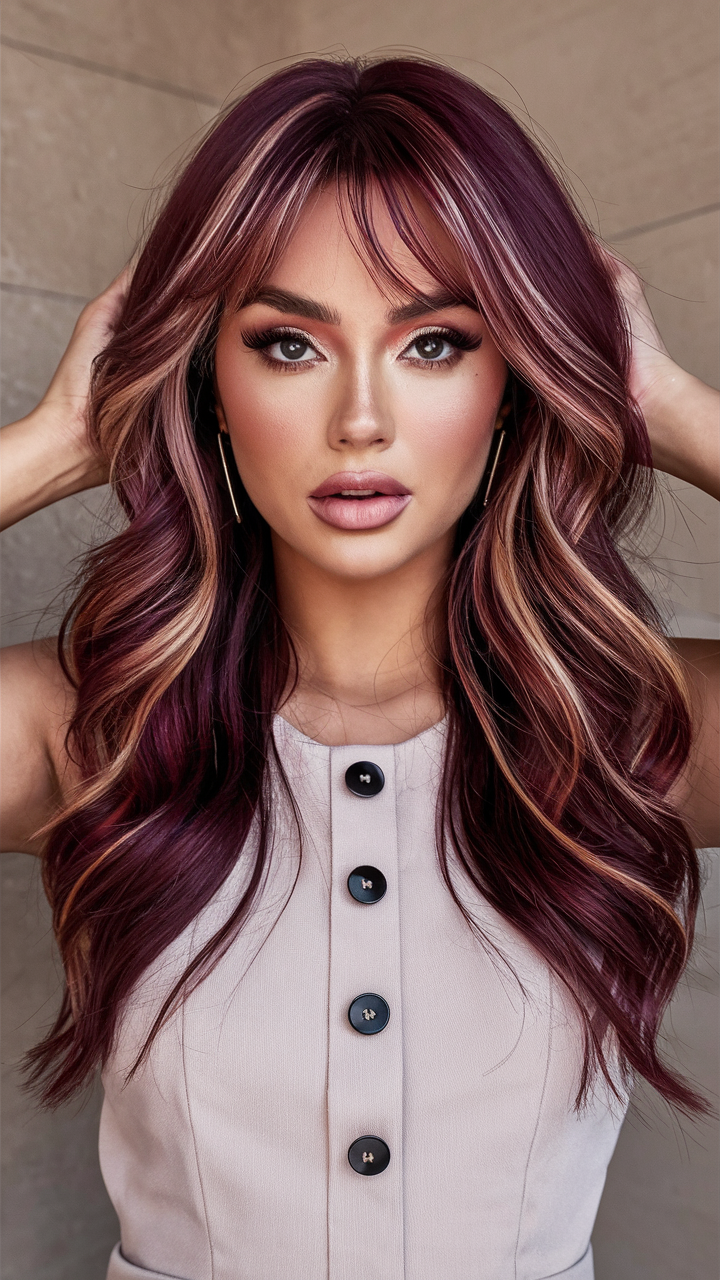 Long Cherry Cola waves are enhanced by contrasting blonde highlights, creating a striking dimensional look. The soft, flowing curls make this style perfect for summer women’s hairstyles. The combination of dark and light tones complements brown skin beautifully, adding vibrancy and balance.