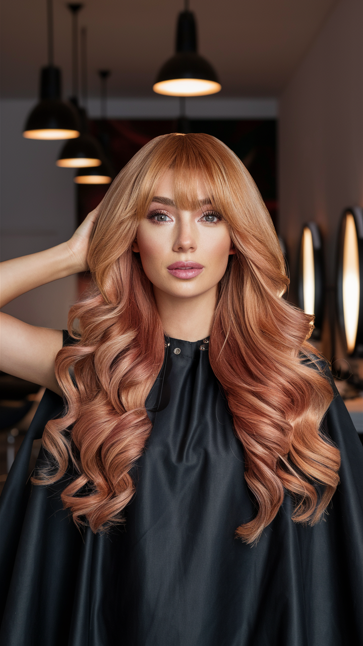 This style showcases long, flowing layers in a warm strawberry blonde hue. The mix of peach and pink undertones gives depth and dimension, complementing the soft waves. Ideal for a sophisticated yet playful appearance, the cut frames the face beautifully.