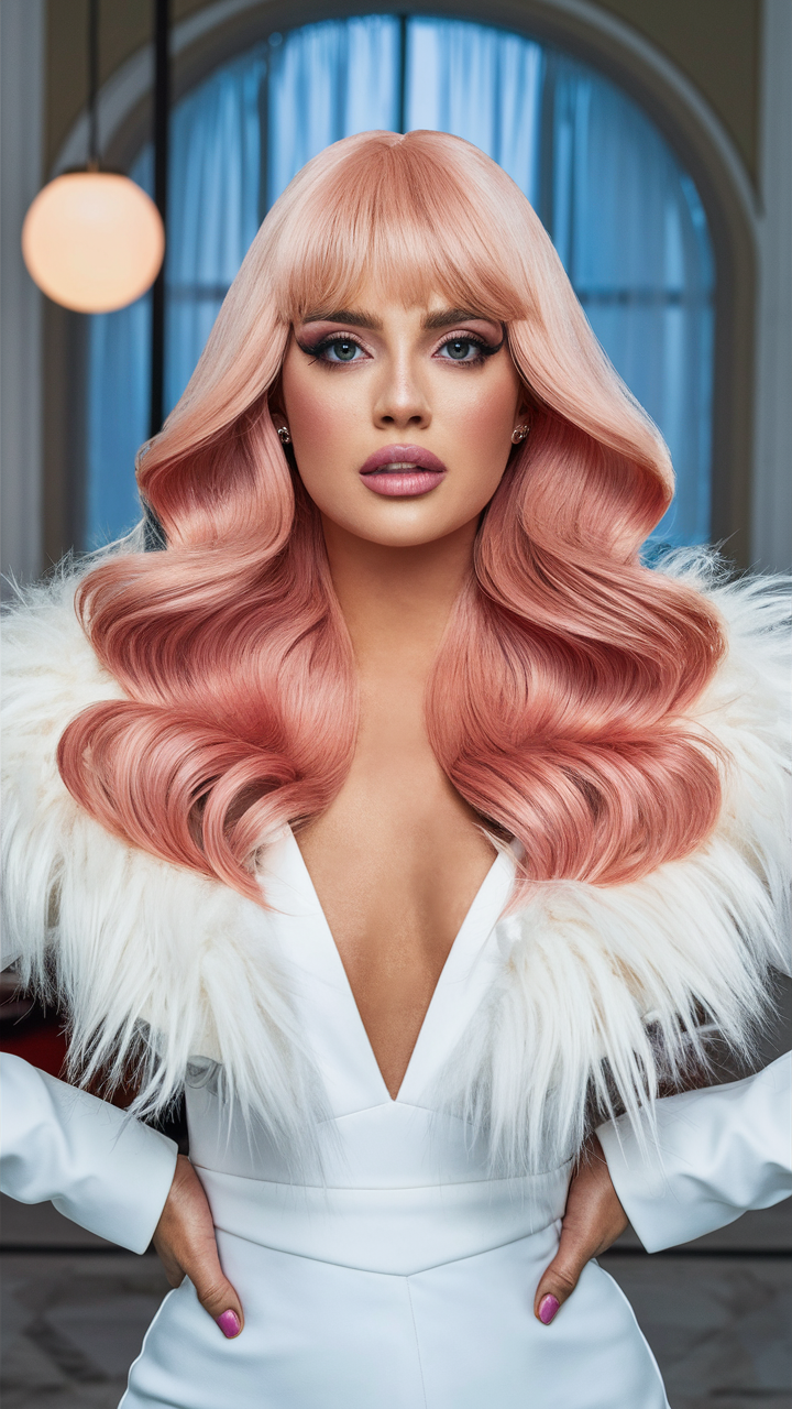 This hairstyle features luxurious, flowing waves in a soft strawberry pink hue, paired with sleek bangs. The glossy finish highlights the rich rose-gold undertones, adding depth and dimension. Perfect for a sophisticated and glamorous look, the waves enhance the hair’s volume and elegance.