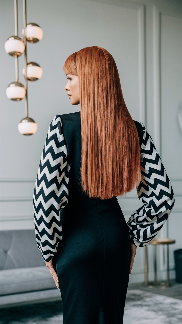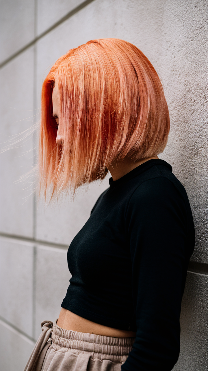 This sleek bob is styled in a rich strawberry orange shade with hints of peach undertones. The straight cut adds sharpness and elegance, while the light layers give it a soft, airy feel. This bold yet minimal style is perfect for those seeking a clean, sophisticated appearance.