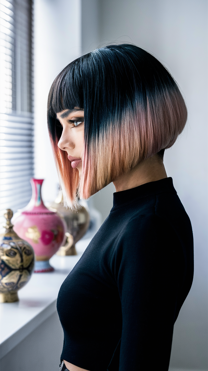 This daring bob features a striking black-to-pink ombre effect. The sharp, angled cut creates a dramatic silhouette, while the soft pink tips add a playful, modern twist. Perfect for a bold and edgy look, the contrast between the dark roots and pastel ends is captivating.