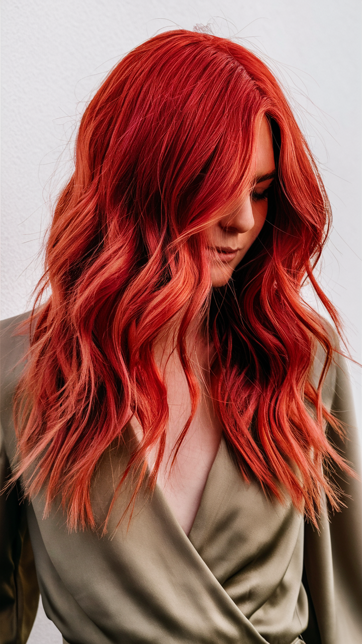 This hairstyle features bold, voluminous waves in a striking vibrant red tone. The rich hue transitions seamlessly into subtle orange undertones, enhancing depth and texture. Perfect for making a statement, the waves add movement and amplify the intensity of the color.