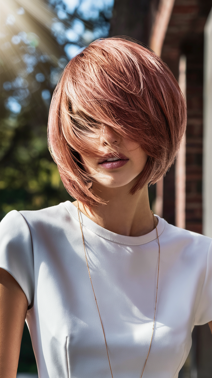 This layered bob showcases a soft rosy pink tone with natural texture and flow. The wispy layers frame the face beautifully, giving a modern and effortless appearance. Ideal for a stylish yet casual look, the rosy hue adds a touch of warmth and sophistication.