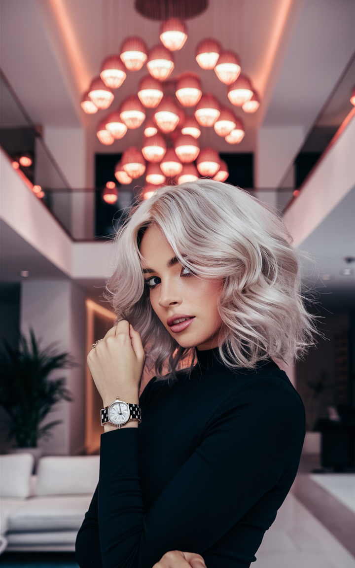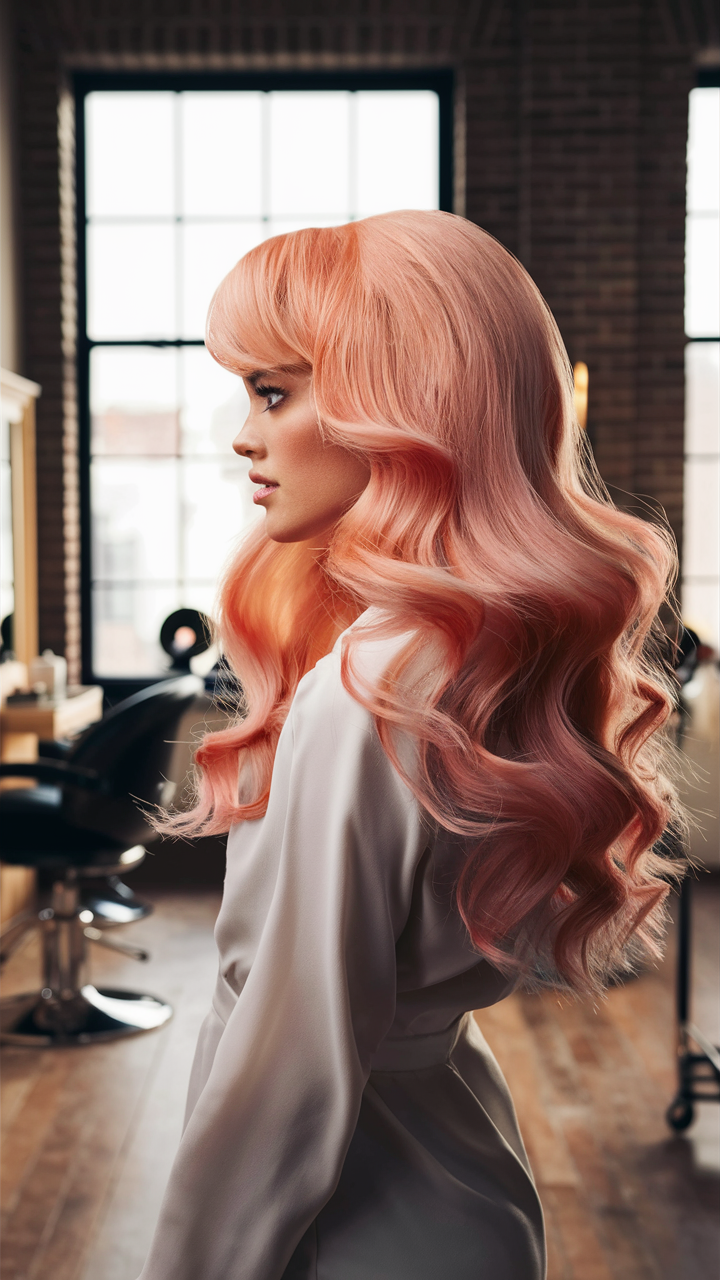 This hairstyle showcases voluminous waves in a soft peach pink tone, blending delicate pastel shades with a glossy finish. The flowing curls add texture and elegance, framing the face beautifully. Perfect for a refined and vintage-inspired look, the peachy hue adds a fresh, radiant touch.