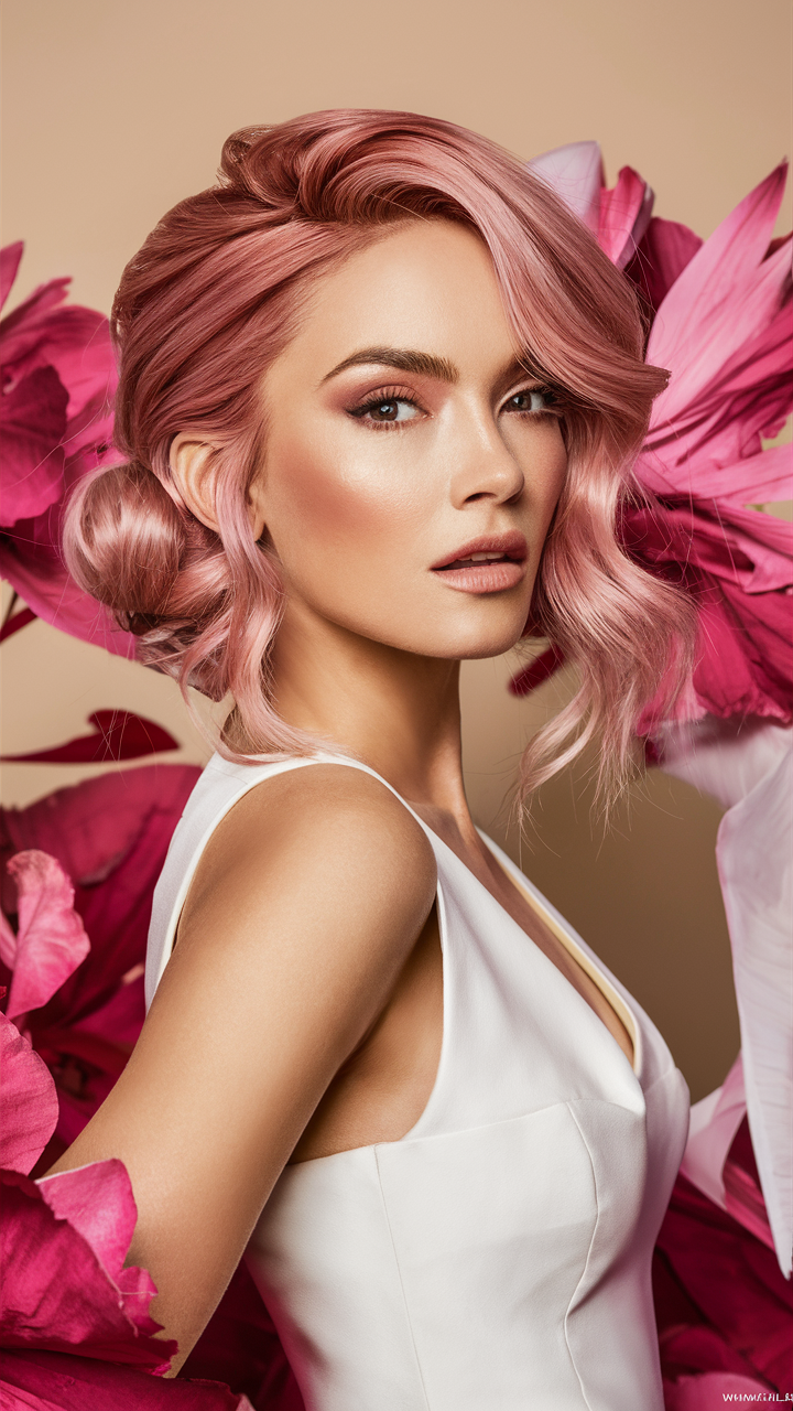 This elegant updo features a chic rosy pink color with subtle hints of peach. The styled waves add softness and dimension, while the gathered bun at the nape exudes sophistication. Ideal for formal events, the rosy tones create a romantic and polished appearance.