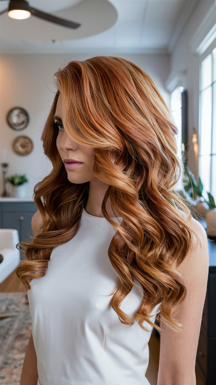 This long hairstyle highlights luxurious, glossy waves in a deep red strawberry shade. The vibrant color is enhanced by a subtle glow, making the hair appear radiant under any lighting. Perfect for a chic and bold style, the full waves create an air of confidence and elegance.