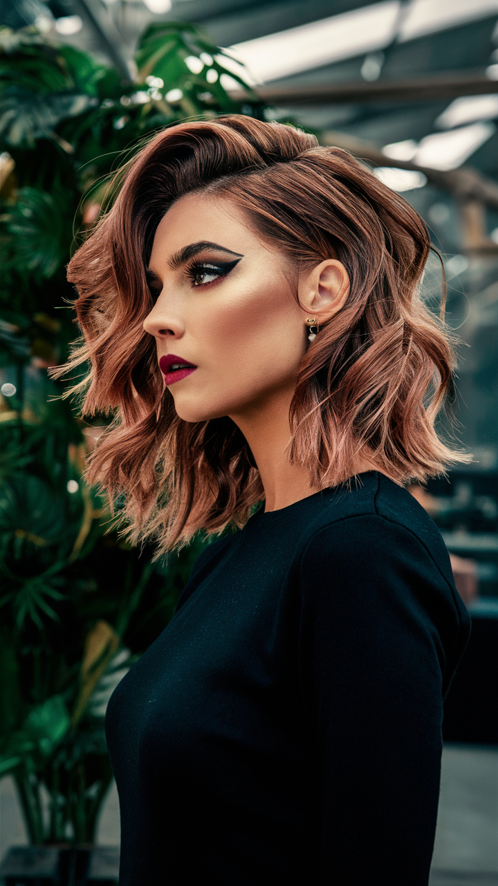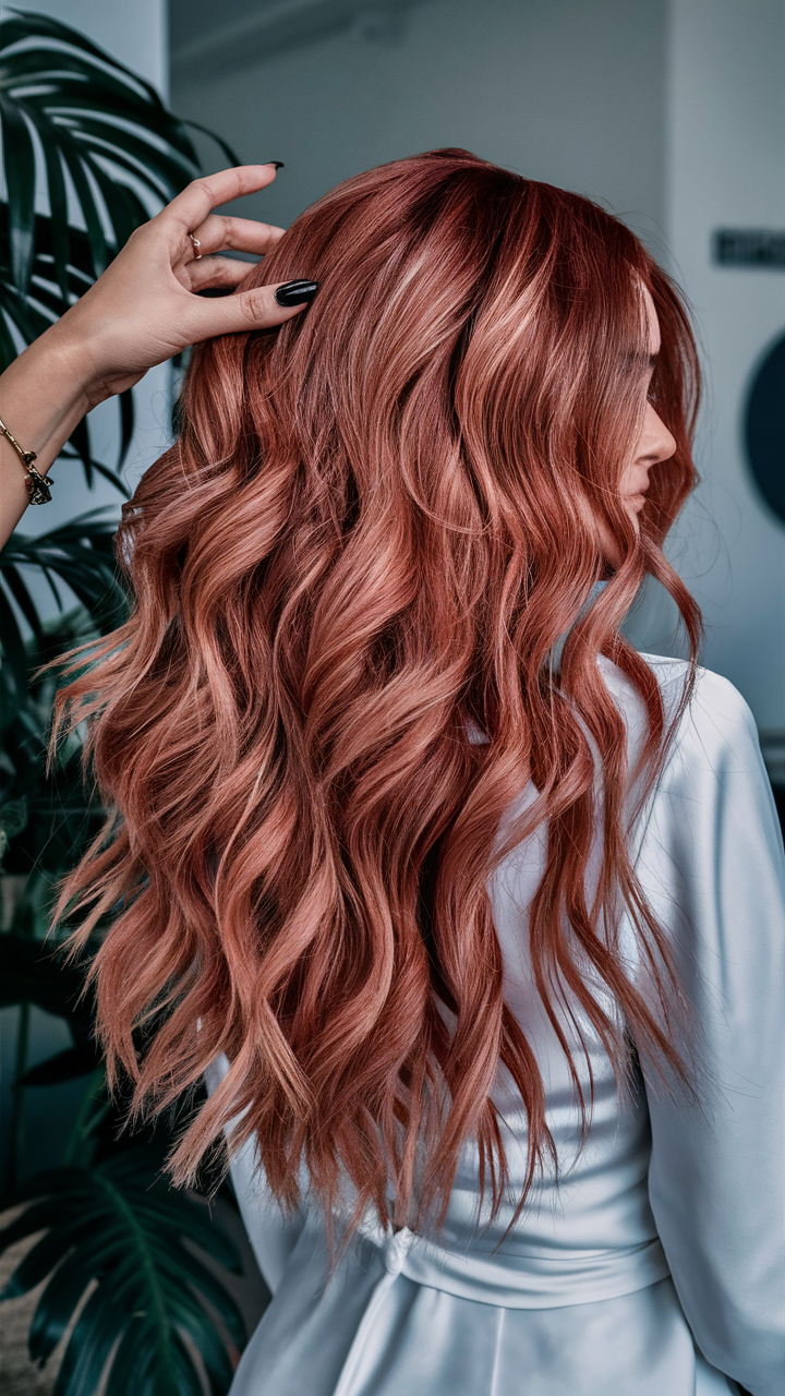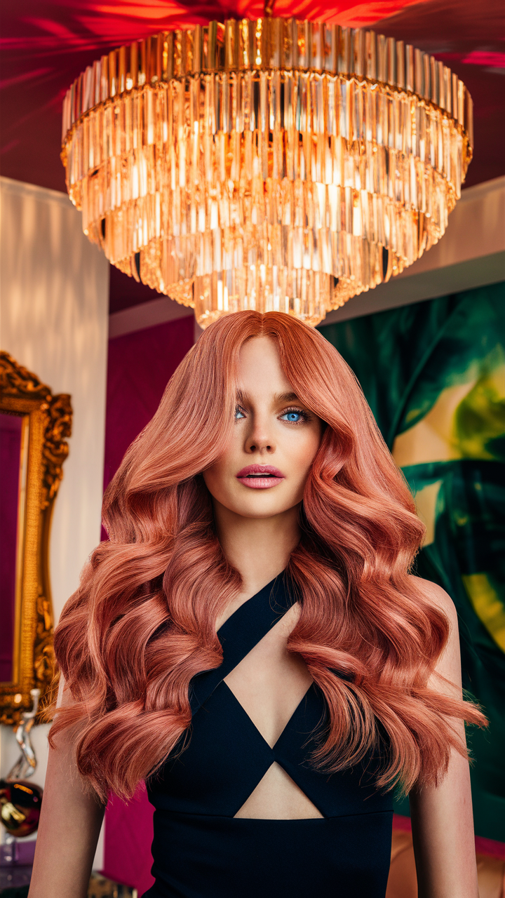 This hairstyle highlights luxurious, flowing layers in a stunning rose gold shade. The soft blend of pink and golden hues creates a radiant and multidimensional effect. Ideal for an elegant and high-fashion appearance, the waves give the hair a polished and voluminous finish.