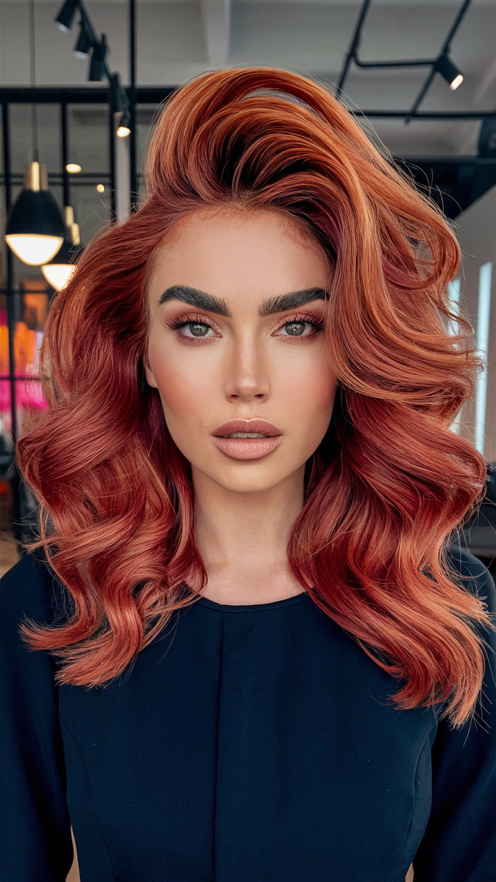 This hairstyle features dramatic, voluminous curls in a rich copper red tone. The fiery hue enhances the texture and depth of the hair, creating a bold and striking appearance. Perfect for a powerful and glamorous look, the curls frame the face with dynamic movement.