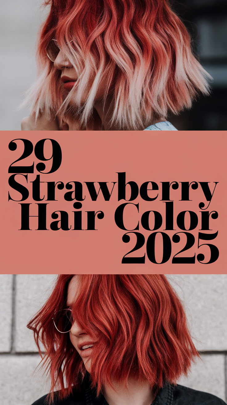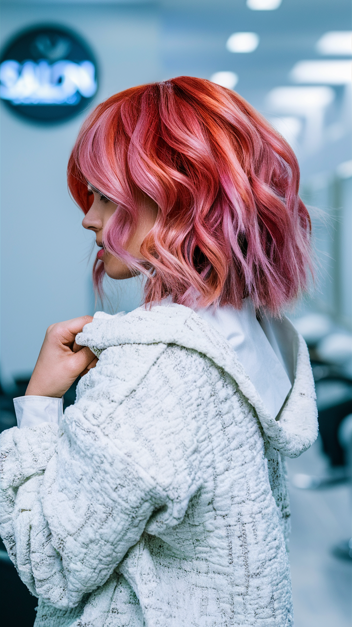This hairstyle emphasizes soft, textured waves in a strawberry pink tone with warm highlights. The loose, natural curls add a playful and effortless vibe to the look. Perfect for a casual yet polished appearance, the warm strawberry tones create a vibrant finish.