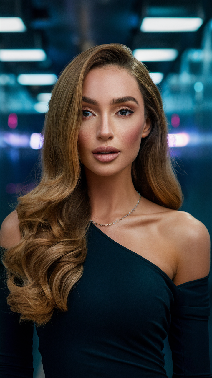 These long, sleek waves feature a light brown hair color chocolate medium, blending soft caramel undertones for a luminous finish. The side part adds a timeless elegance, making it ideal for formal occasions. This polished style works beautifully for straight and wavy hair types.