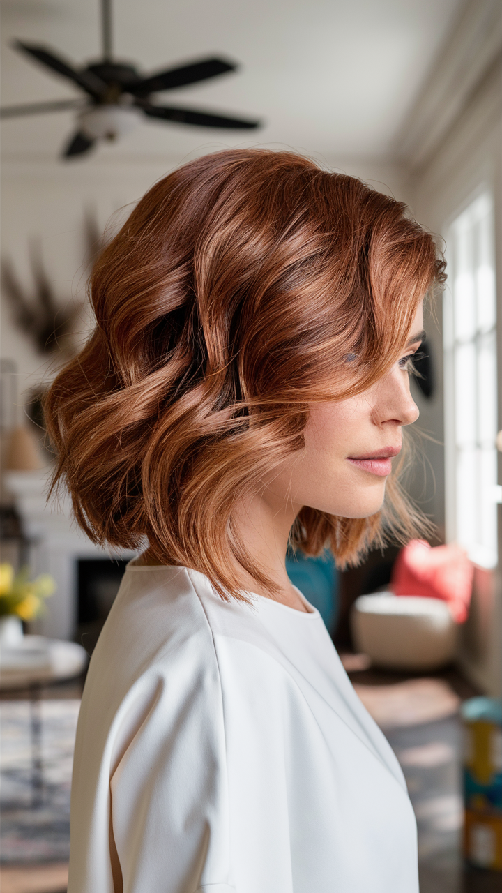 This chic bob combines light brown hair colors with red highlights, creating a dimensional and vibrant look. The loose waves add texture and volume, perfect for curly or wavy hair patterns. Its rich auburn finish is both modern and versatile for any season.