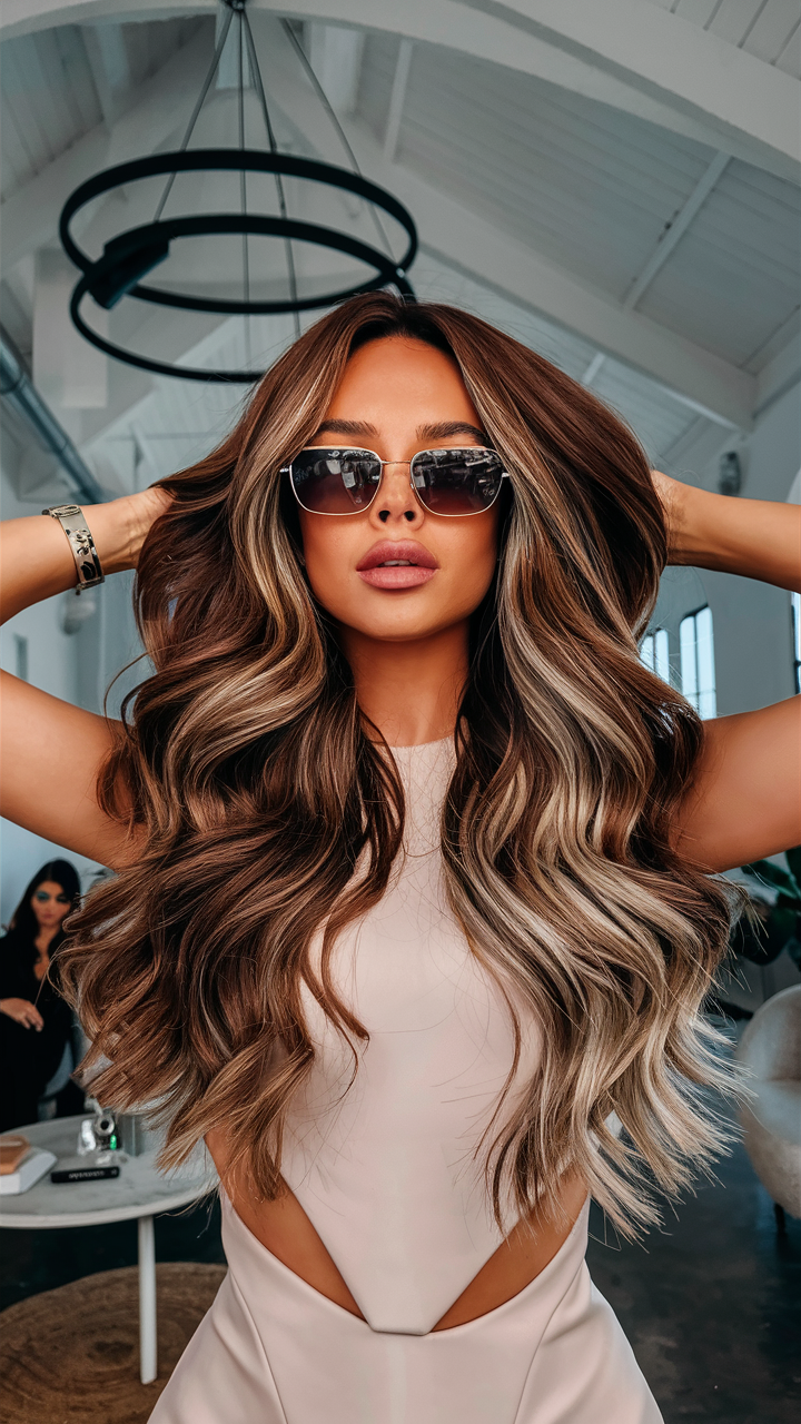 This flowing hairstyle showcases light brown hair colors with highlights, blending golden and honey tones for a warm, radiant effect. The soft layers and full fringe add texture and movement, making it perfect for wavy hair. It’s an ideal choice for those seeking a youthful and fresh color palette.